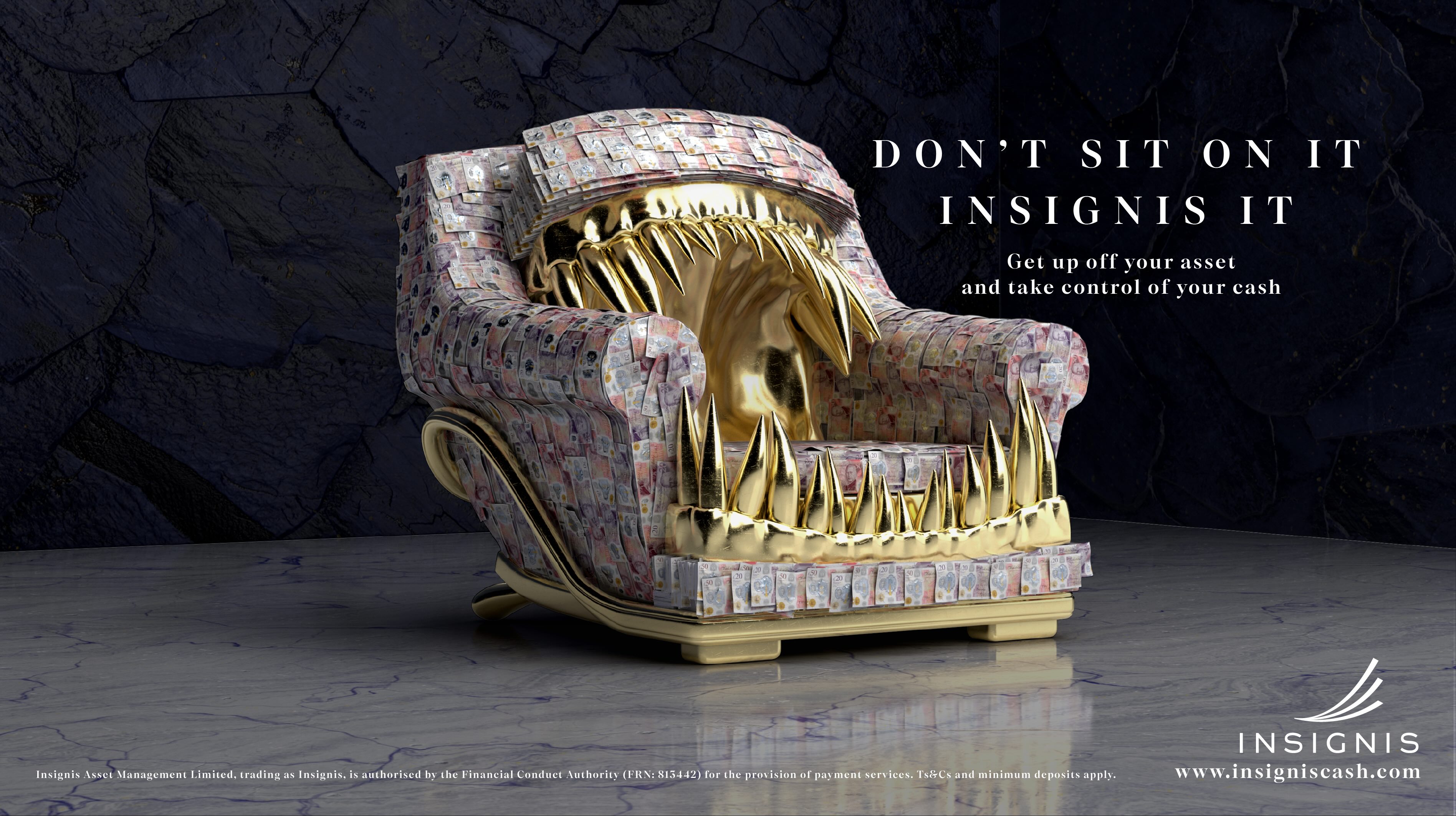 At the centre of the campaign is a highly crafted chair made of money and menace - a sculptural metaphor for the risk of holding onto cash without a strategy. It fronts a muti-channel push across national press, digital, OOH, experiential and DM.